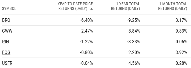 The monthly losers, while disappointing, the silver lining is that all but 1 are above the S&P 500 YTD return of +10.76% (AMGN, the exception +7.47% YTD–not too gloomy). The loser board has no positions both with MTD and YTD losses, unlike the winner board, above (this is optimal). Cancer biotech holding, AMGN is an 8% holding in the Alphavest Aristocrats Portfolio +9.36% vs. DJIA +8.55%, YTD, and it’s underperformance is not hindering the Aristocrats Portfolio from outpacing its benchmark/DJIA, YTD. With a 3.4% dividend yield and a 3 Star Morningstar rating, AMGN remains a hold.