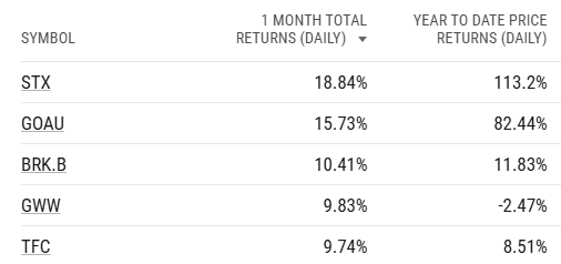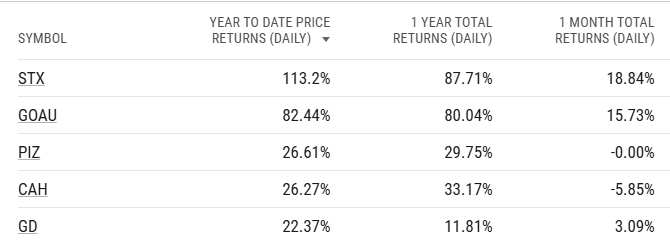 Gold play, GOAU and dividend hefty tech play, Seagate/STX are both on this month’s MTD and YTD winner boards. STX, with a 1.63% dividend yield was a new add to the Alphavest Equity Income Portfolio, replacing Eli Lily/LLY in May–since replacement, LLY is -1.14% and STX up +91.05% (not a typo and certainly a first for AV Equity Income Portfolio for a 4 month return!). AV Equity Income boasting a yield of 2.35% is outpacing benchmark index, the Dow Jones Industrial Average/DJIA, up +12.69% vs. DJIA +8.55% YTD. Thte DJIA yield is 1.46%.